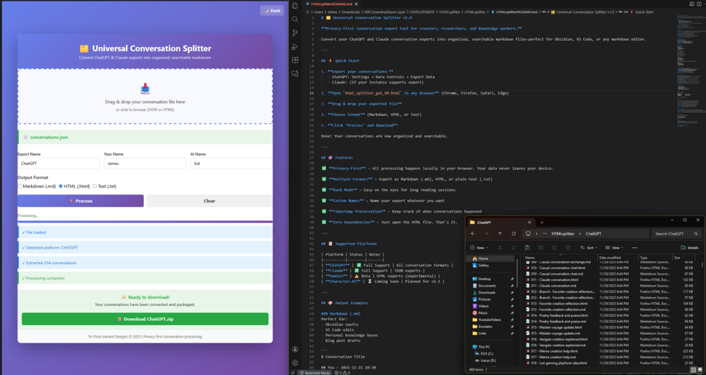 Convert your ChatGPT and Claude conversation exports into organized, searchable markdown files—perfect for Obsidian, VS Code, or any markdown editor.
